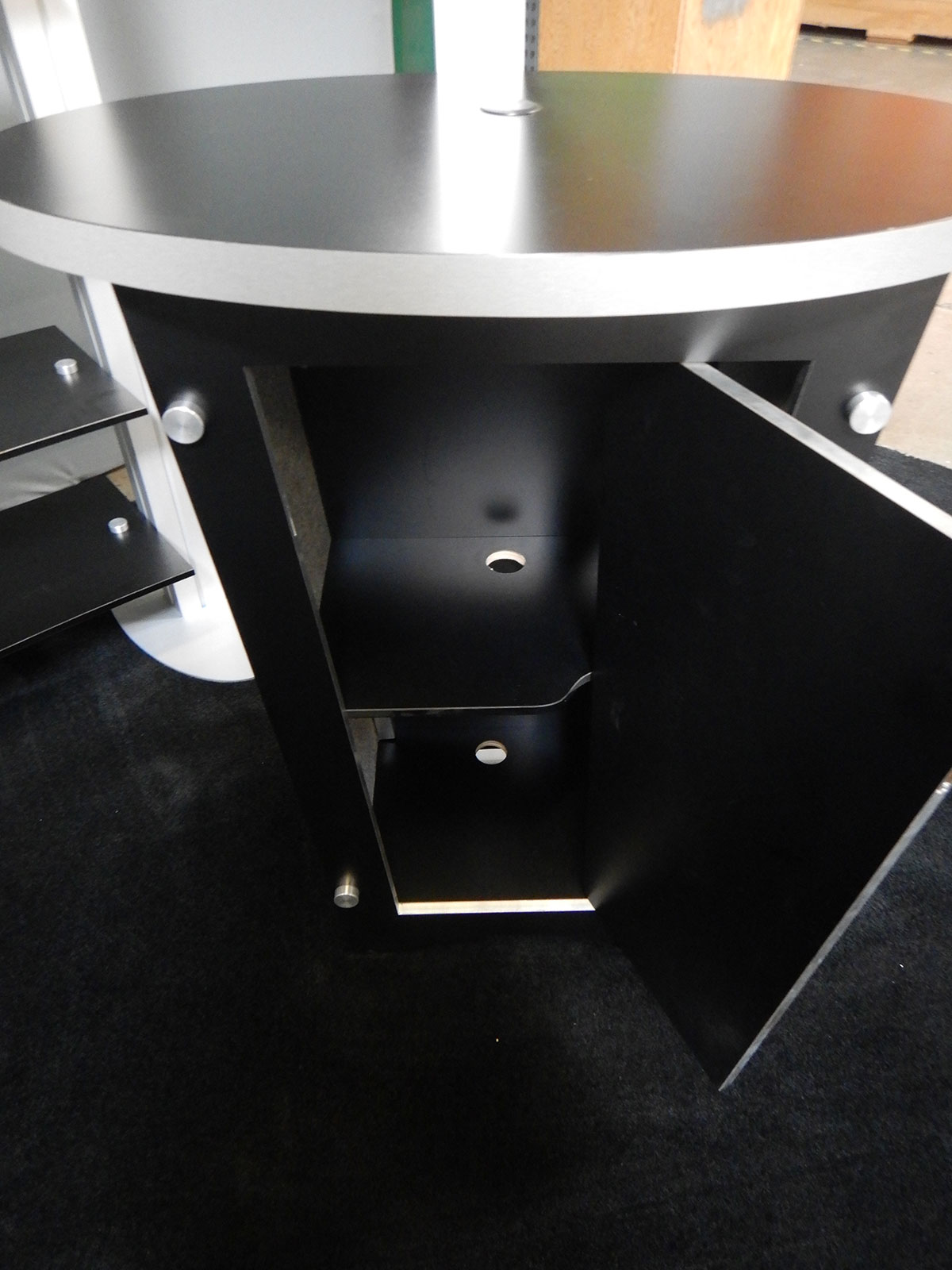 Black Laminated Shelving, Circular Carpeted Platform, and Direct