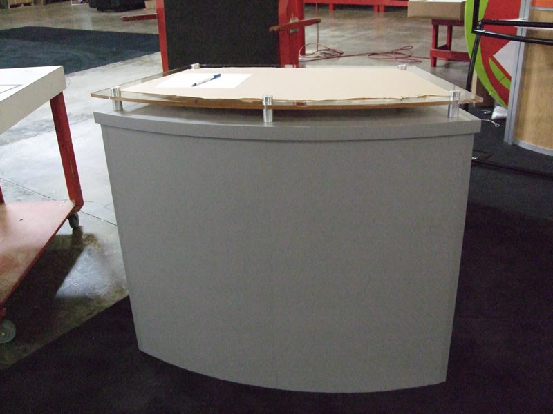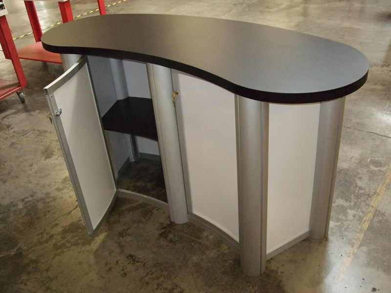 MOD-1210 Trade Show Kiosk with Locking Storage and Tension Fabric Header (not shown). MOD-1209 and MOD-1208 are Similar Kiosks