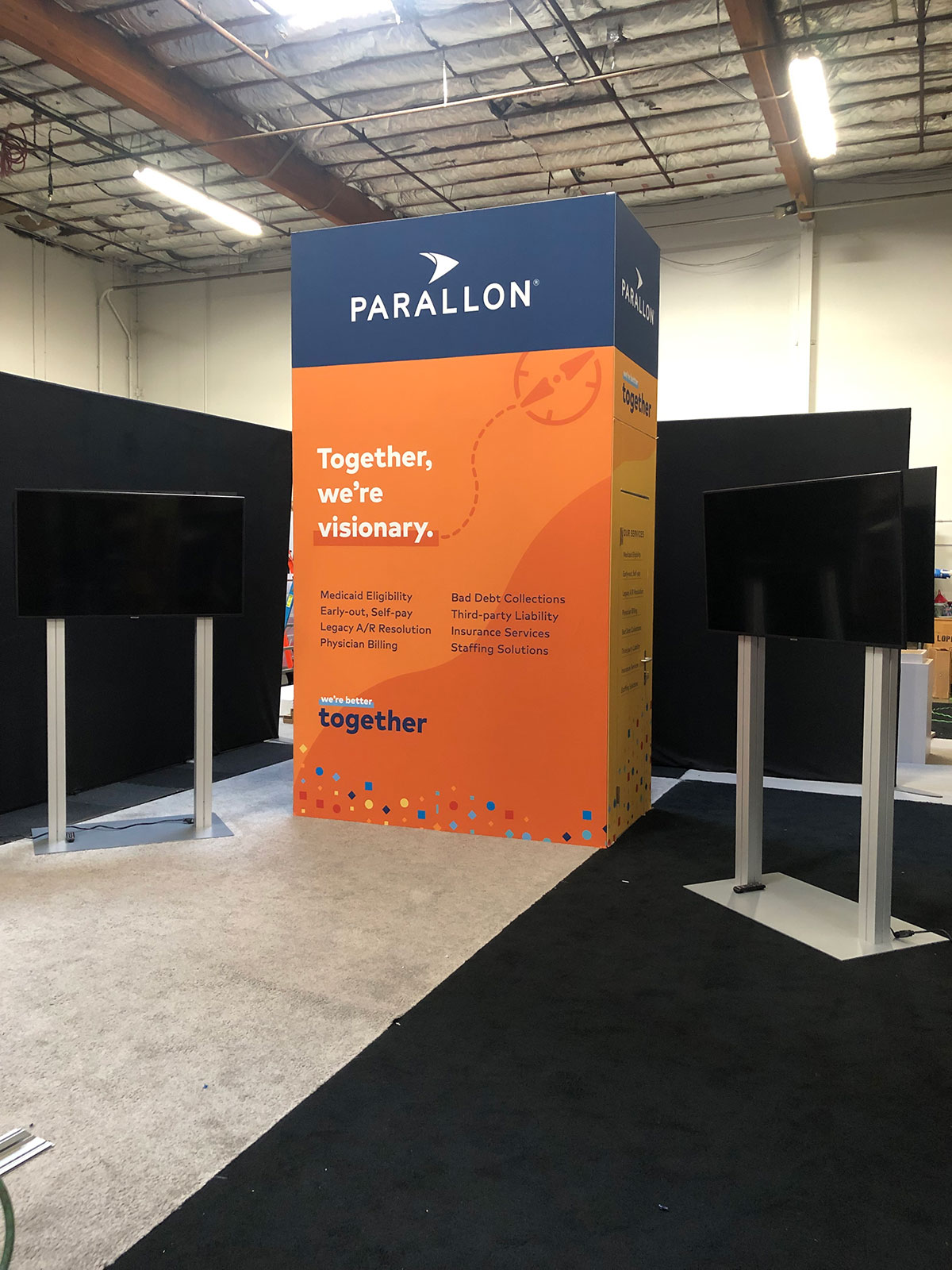 RENTAL: 12 Ft High Gravitee System Storage Closet Tower with Locking Door, (2) RE-1229 Large Monitor Kiosks, and SEG Fabric Graphics Island Rental Tower -- View 2 Island Rental Tower -- View 3 Island Rental Tower -- View 4