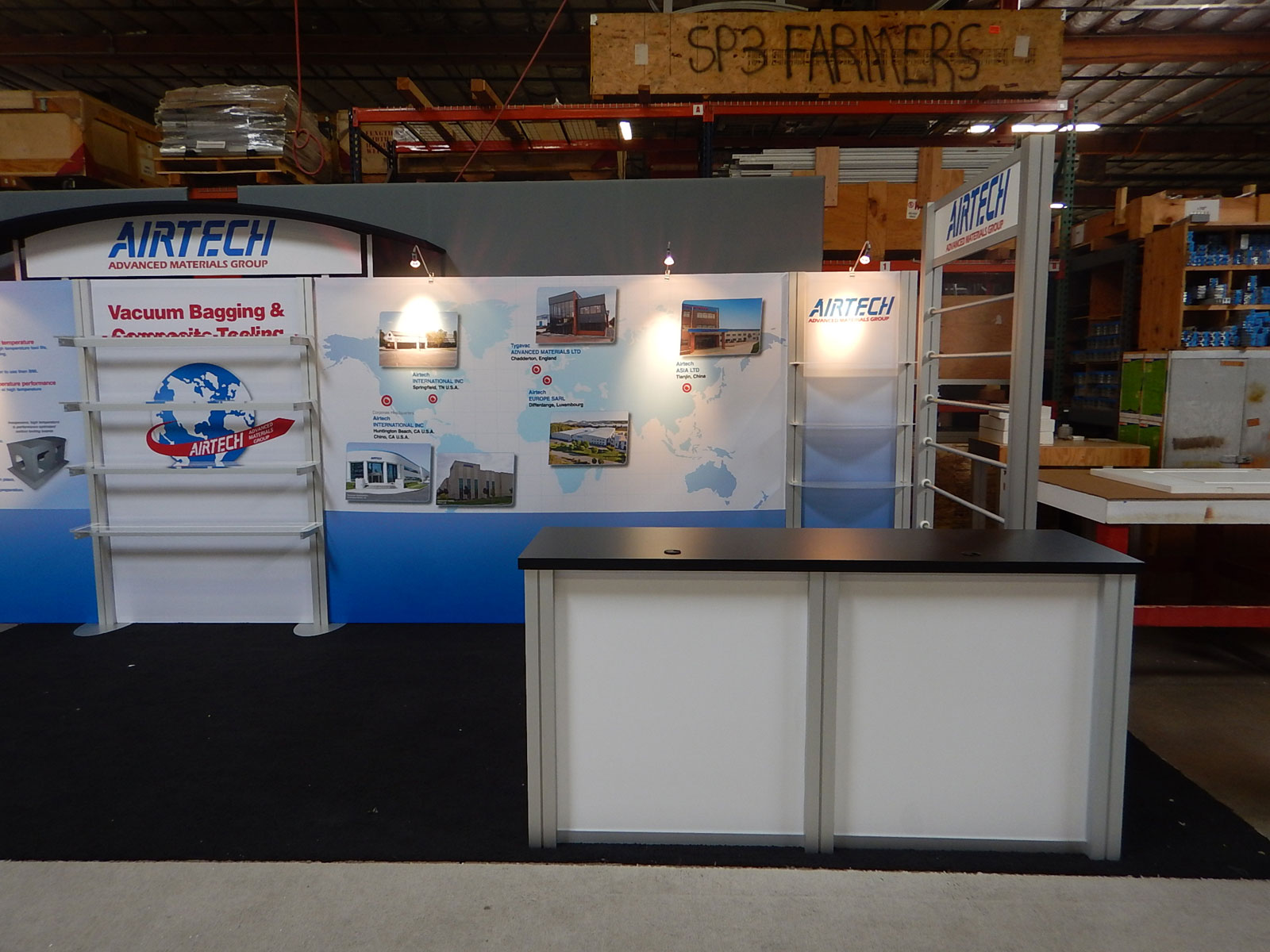 RENTAL: Inline with Arch Canopy, (6) Arm Lights, RE-1202 Rectangular Counter, (2) RE-1207 Large Rectangular Counters, Small and Large Clear Acrylic Shelves, Custom Product Display Kiosk, Tension Fabric Graphics, and Sintra Header and Counter Graphics