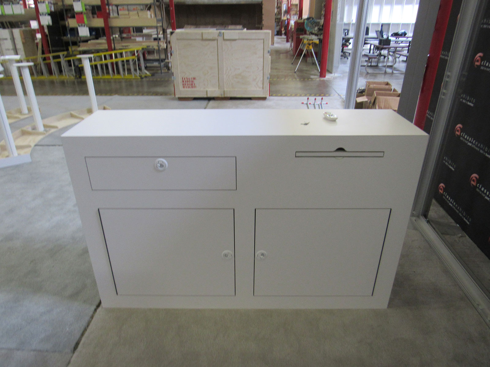 Modified MOD-1563 Custom Counter with Graphic, RGB Programmable LED Lighting, Locking Storage, Drawer, and Slide-Out Shelf Modified MOD-1563 Custom Counter with Graphic, RGB Programmable LED Lighting, Locking Storage, Drawer, and Slide-Out Shelf