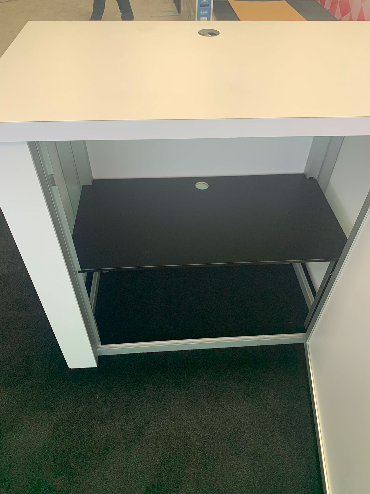 RENTAL: RE-1079 Lightbox with Large Monitor Mount & Extrusion Supports, 43" Monitor, RE-1202 Reception Counter, SEG Backlit Fabric Graphics, and Direct Print Sintra Graphics for Counter. RENTAL: RE-1202 Reception Counter and Direct Print Sintra Graphics for Counter. RENTAL: RE-1202 Reception Counter, Locking Storage, and Direct Print Sintra Graphics for Counter.