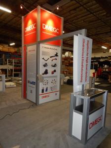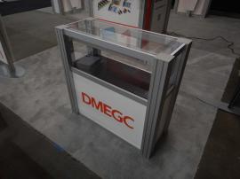 RENTAL: Modified RE-9068 Island with 12� High Tower with Locking Door for Storage, Halogen Arm Lights, (4) RE-170 Literature Shelves, (3) RE-502 Small Display Cases, (2) RE-1202 Rectangular Counters with Locking Doors & Interior Shelves, and Sintra Graphics