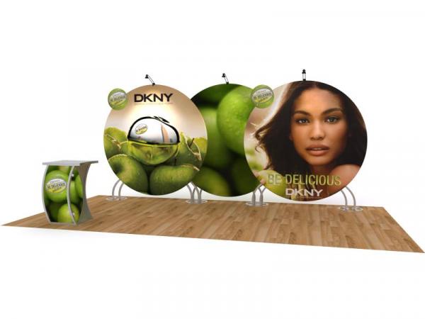 Whatever design you choose for your next trade show exhibit make sure it reflects your organization's overall vibe. The TF series has two distinct advantages. First, the round display design makes a strong visual statement. It's unmistakable on any show floor. Second, the assembly is decidedly casual with push-button connectors for the large center ring. The larger graphics are tension fabric pillowcases with zippers. Nothing could be easier. There's even a standoff graphic for additional branding and a curved pedestal with locking storage.